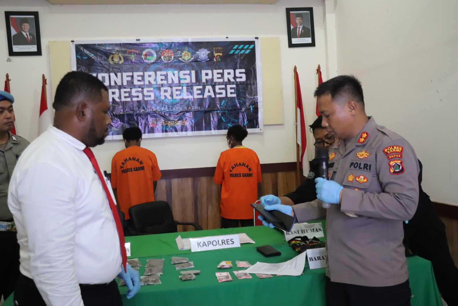 Sarmi – Kepolisian Resor (Polres) Sarmi menggelar konferensi pers terkait pengungkapan kasus penyalahgunaan narkotika jenis ganja yang melibatkan dua orang tersangka. Press release ini dipimpin langsung oleh Kapolres Sarmi AKBP Ruben Palayukan, S.Pt.,S.I.K dan didampingi Oleh Kasat Narkoba serta Kasubsi PIDM Humas Polres sarmi yang di gelar di Aula Vicon Mapolres Sarmi pada Senin (1/9/25)